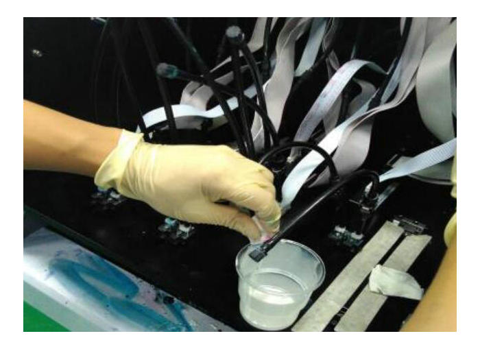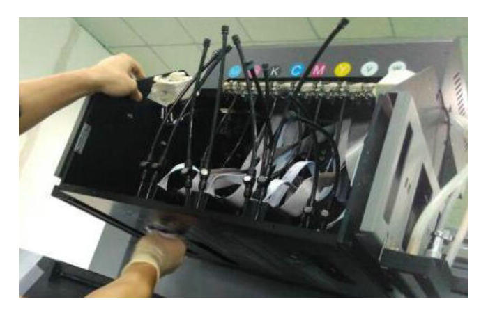 3. 彩墨或者白墨打狀態部分孔發虛。確認溫度電壓波形正確後,可使用高壓的方法。但前提是執行了上述兩個步驟仍沒有效果,才可以使用高壓的辦法。關閉清噴,不需要降低負壓。以強壓淺紅為例,如下圖,把UV打印機所有墨閥關閉,右手拿墨閥按上需要強壓墨的噴頭上,隨時準備開閥,左手按壓墨按鈕5秒,然後右手開墨閥 1 秒,再左手鬆開壓墨。最後擦幹淨噴頭,打狀態條查看。