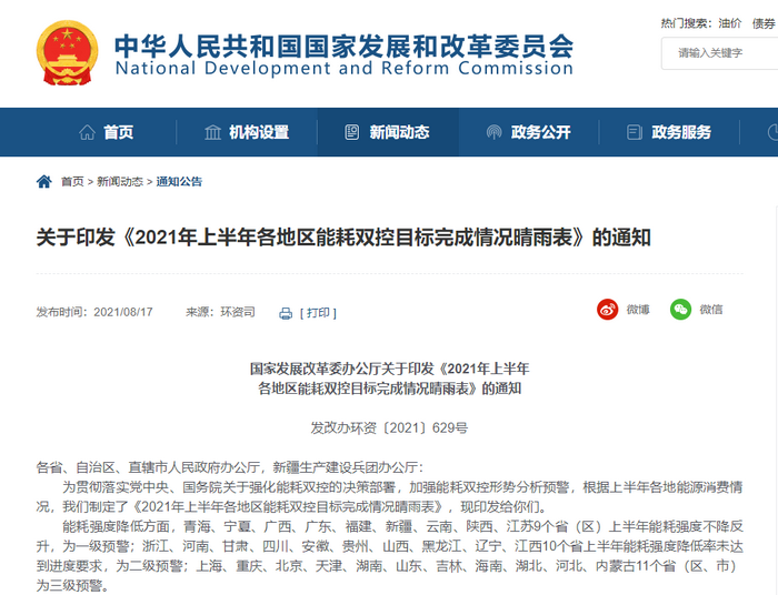 那麽,國家為什麽突然要進行限電政策呢?縱觀今年的商品市場,受煤炭價格大幅上漲且持續高位運行影響,國內電力麵臨供需緊張局麵,許多發電企業邊發電邊虧損,但國家規定電價不能隨行就市輕易調整。另外,隨著“碳中和”概念的提出,國家對各省份也製定了能耗雙控的目標。8月份國家發改委對各地區能耗的調查數據顯示,多個省份已經亮起紅燈,形勢十分嚴峻。